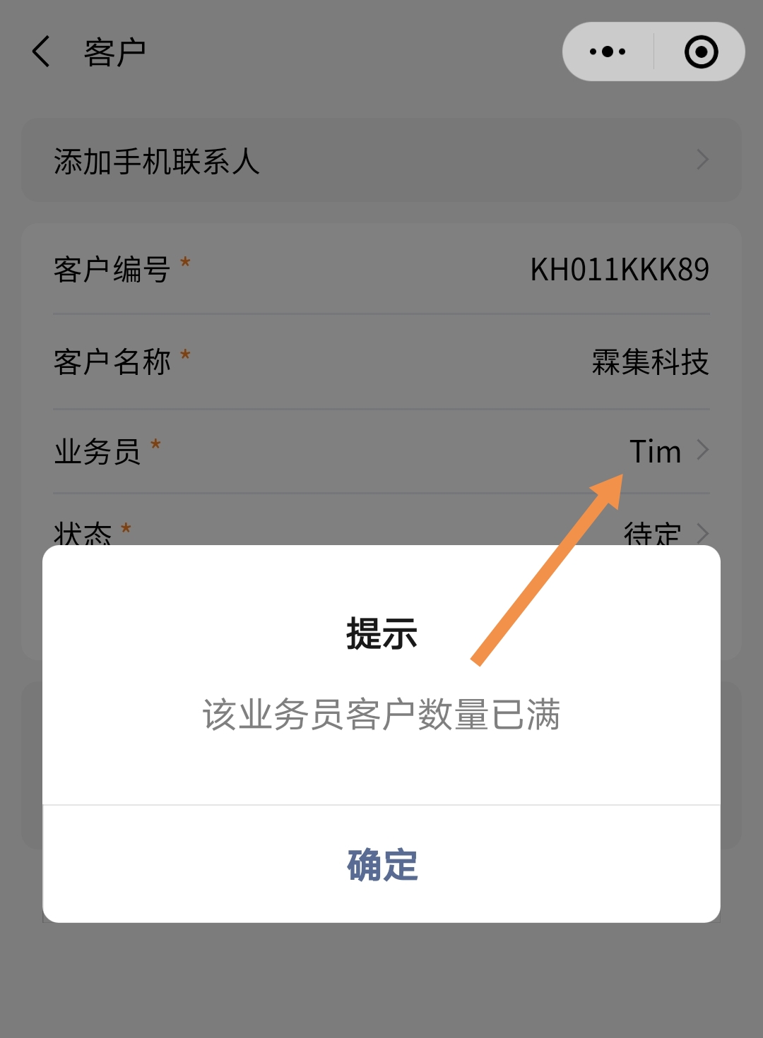 3.新增或者分配客户时,若超过,则不允许保存或分配,有提示:该业务员客户数量已满。