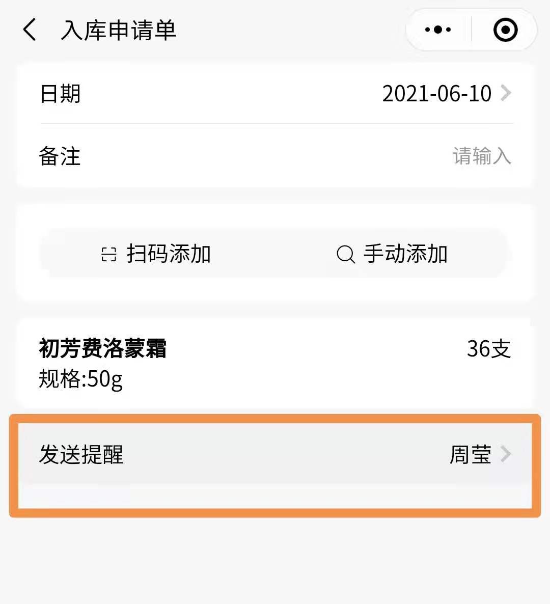 2.新增一个单据,例如入库申请单,选择需要提醒的人员,保存单据。