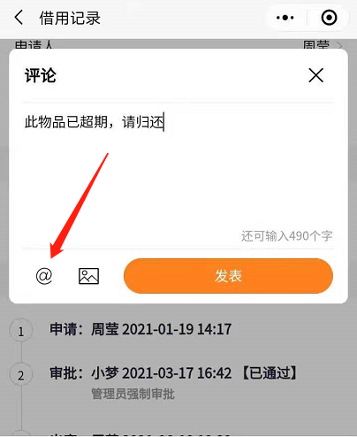 1.在借用记录讨论区中,可以发送消息,必要时可以@相关人员。