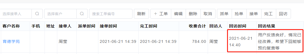 3.工单将自动显示回访内容及相关回访时间,便于后续做进一步的跟进等。
