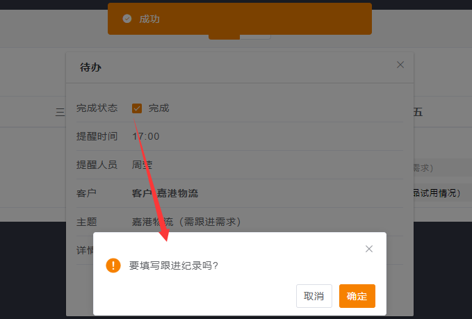 3.点击提醒,勾选完成时,会提示:要填写跟进记录吗?