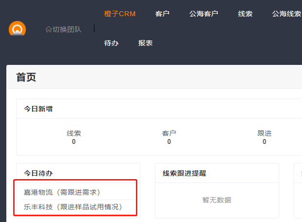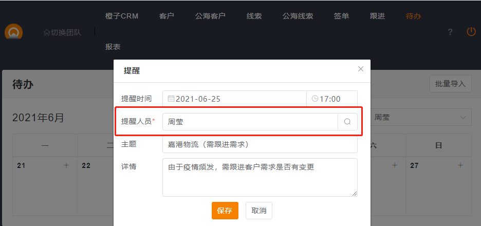 CRM除了公海提醒,跟进提醒外,还可以单独设置待办提醒,设置对应客户,对应时间,对应提醒人的提醒,还有是否完成的状态。