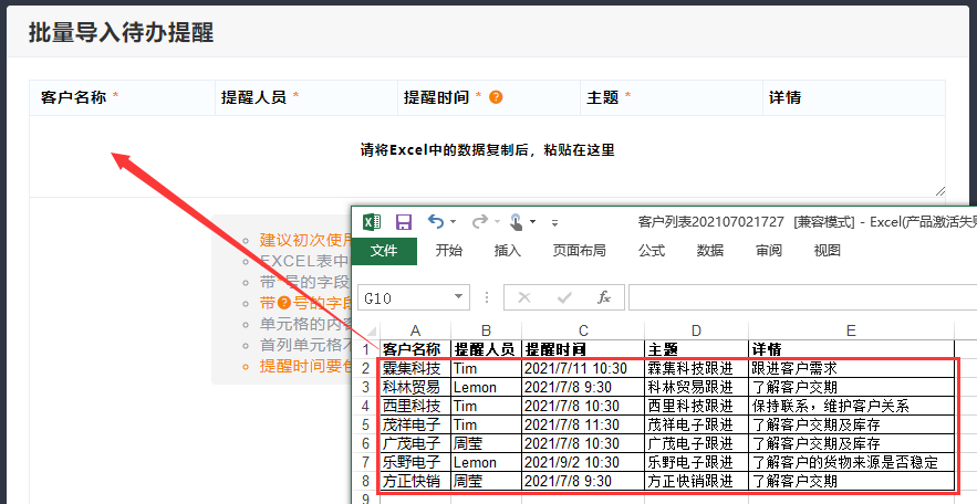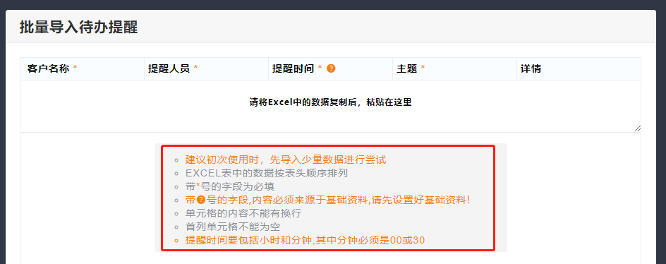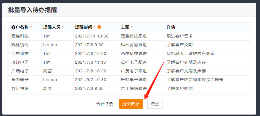 CRM的待办提醒不仅可以逐个设置,还可以批量导入设置。
