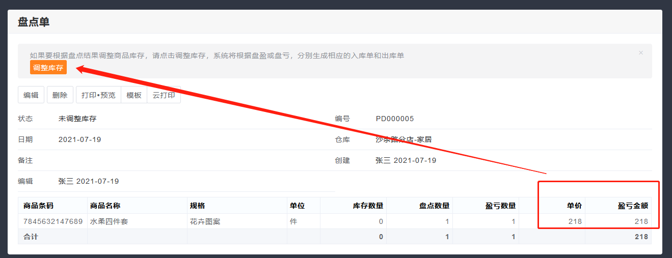 2.生成的盘点单,调整库存。