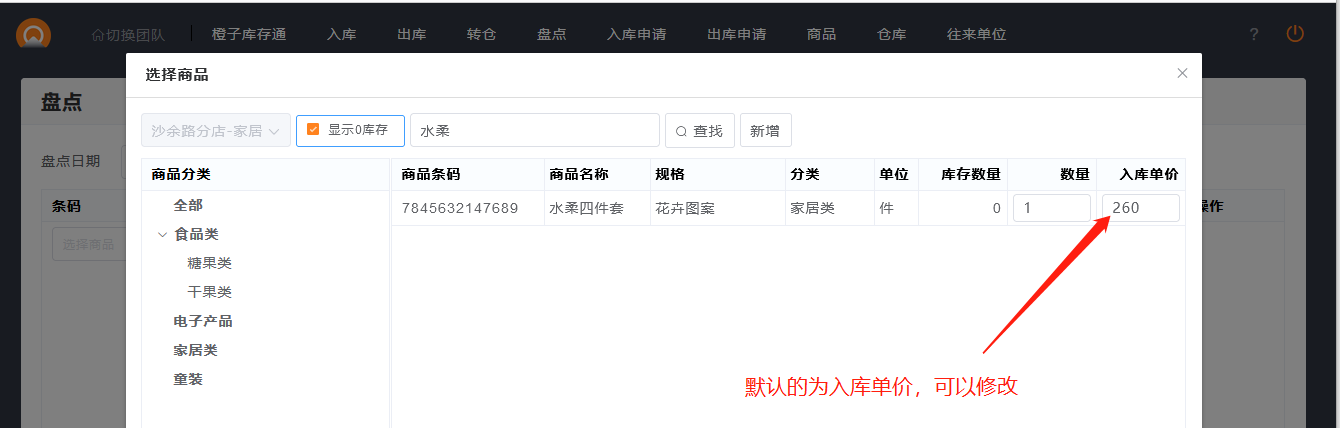 1.盘点表选择商品,可以修改默认的入库单价。