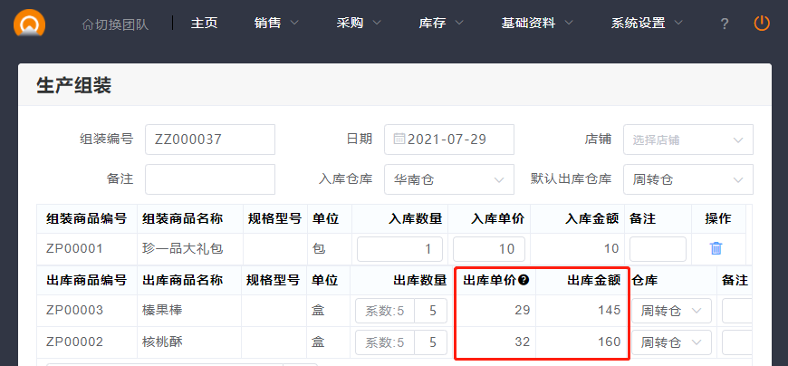 4.选择模板后,出库商品对应的出库单价和出库金额,是从系统中自动读取的成本金额,此时组装商品入库单价是成本单价,也可以自己修改为成本金额。