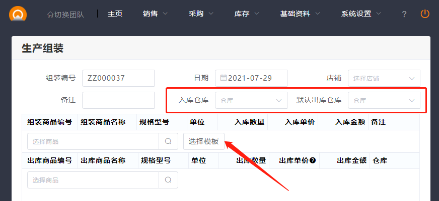 3.新增生产组装单,选择对应仓库后,可以选择组装商品和出库商品,也可以直接选择模板。