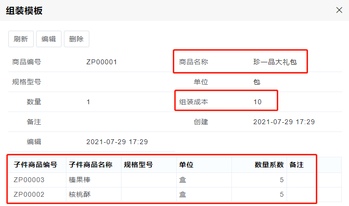 也可以设置组装模板,新增组装单时直接选择模板。