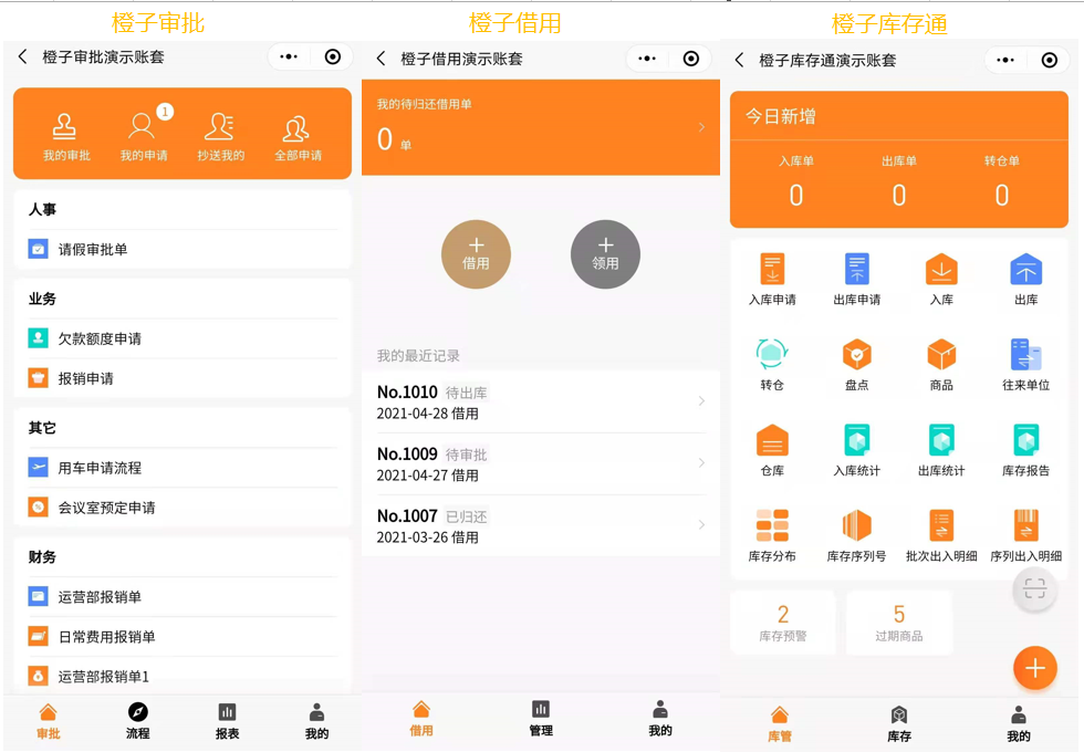 橙子办公有18个小程序模块,关于物料采购审批,以下几个不同的小程序,都有申请审批的功能,但偏重点不同。