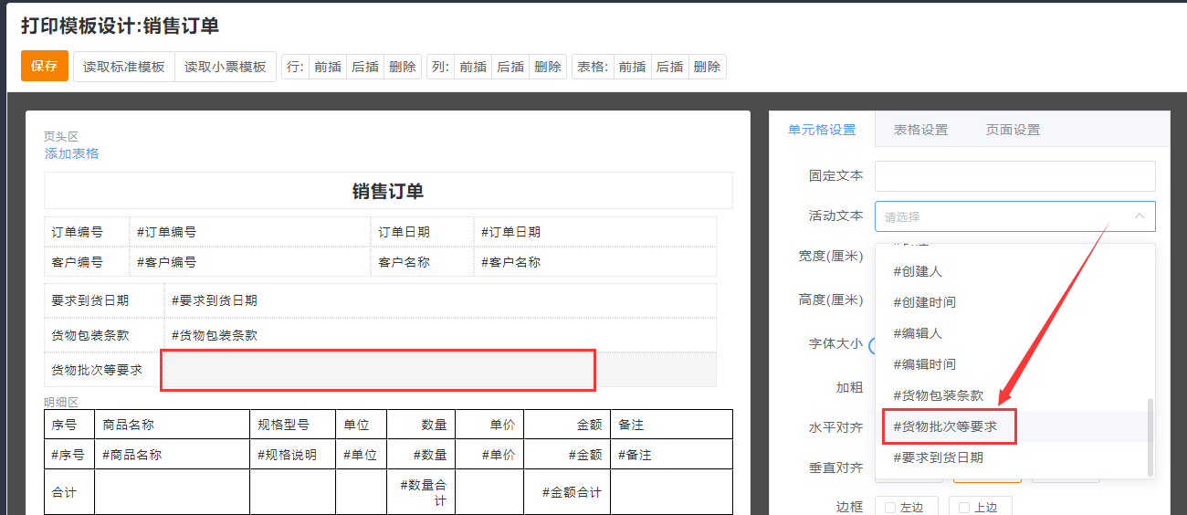 3.返回打印模板中,设置新的表格后,可以在活动文本中,选择到对应的自定义字段。