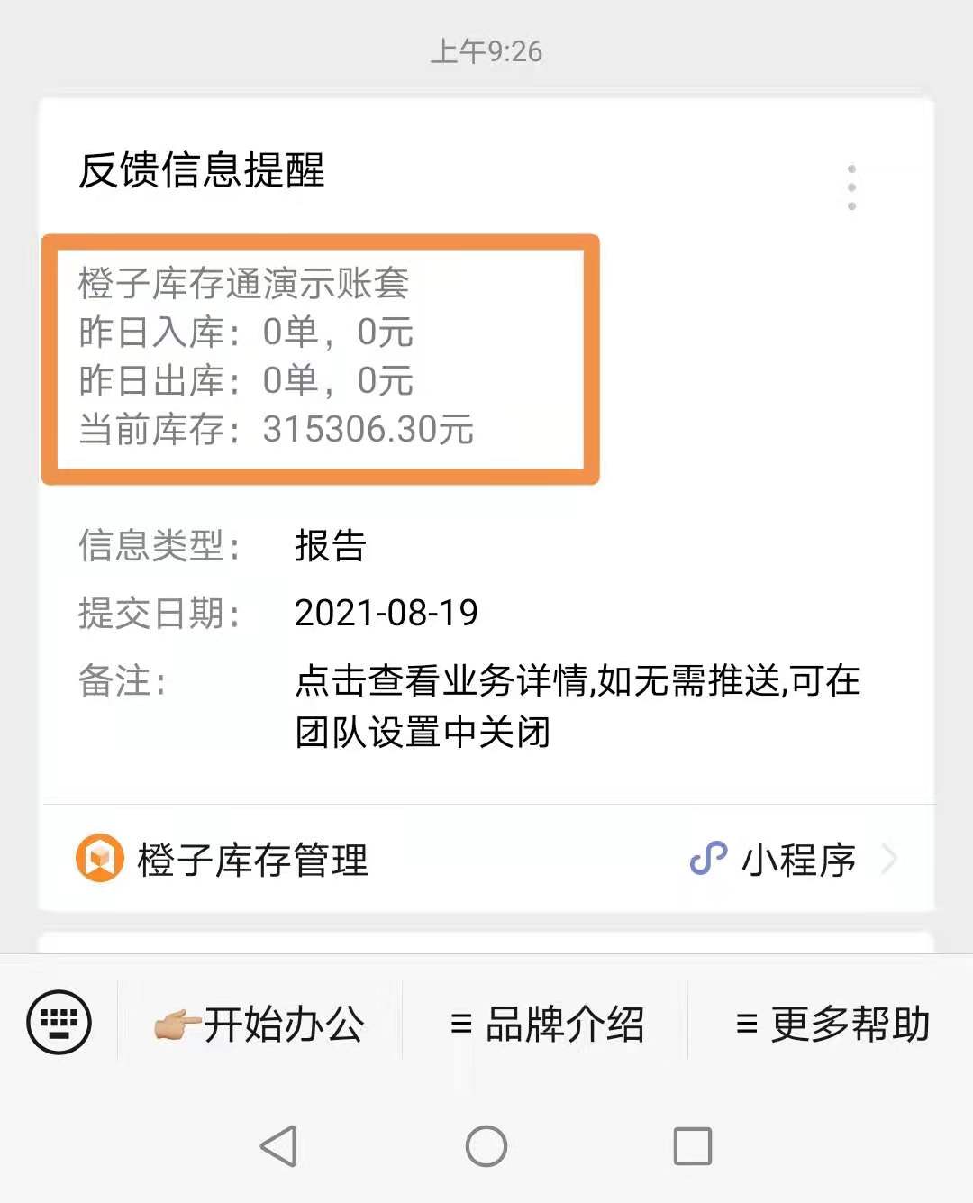 库存通的报告推送开启后,团队管理员每天可以收到昨日的统计报告,掌握昨天的具体出入库数据等。