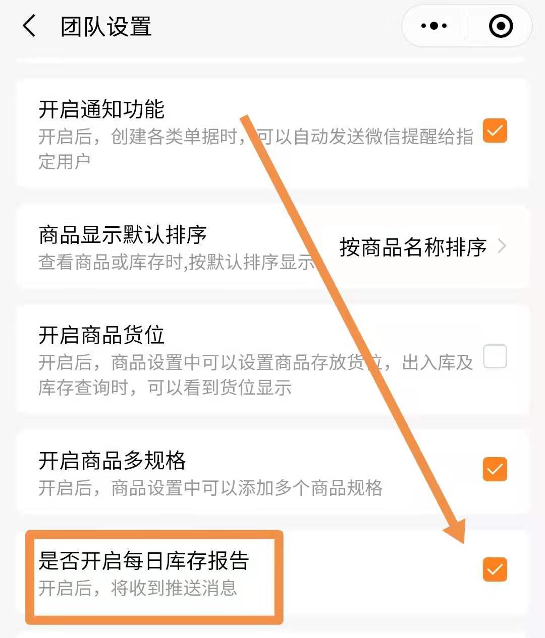 1.管理员在团队设置中,开启每日库存报告。