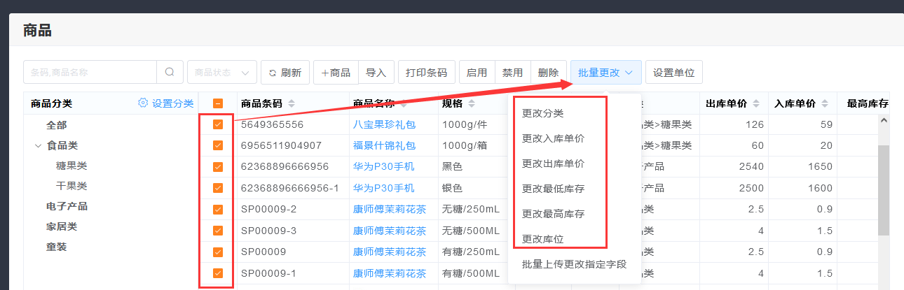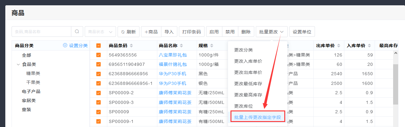 橙子库存通的商品资料可以批量导入,在批量导入后后,如果有其他字段需要再次更新时,可以试试批量更新商品资料。
