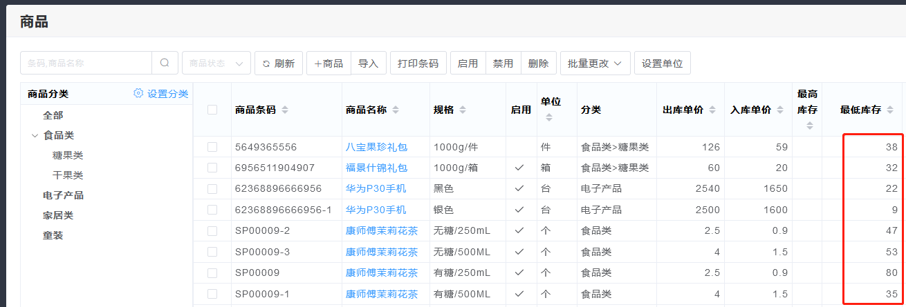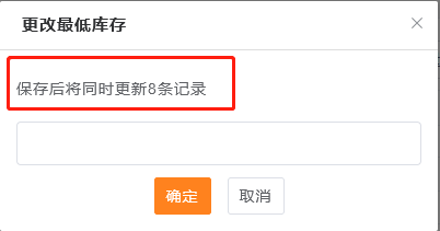 点击更改最低库存,输入数值,保存后,这8个商品的最低库存数量将更新为一样的数值。