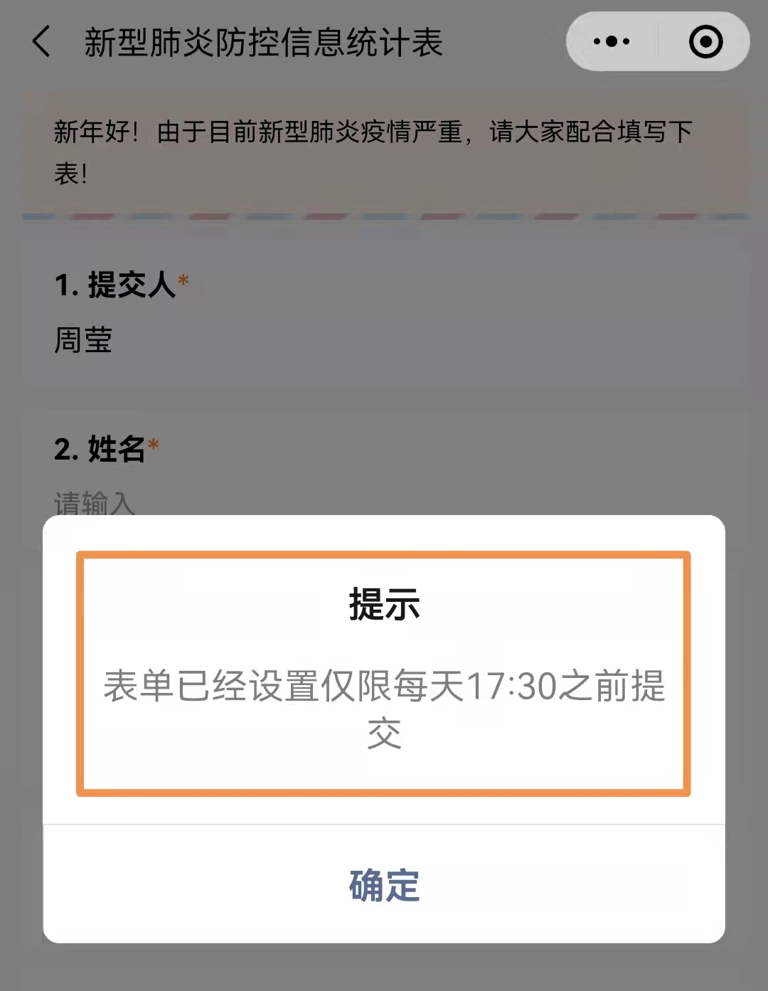 2.在当天超过17:30后,提交表单,会有提示:仅限17:30之前提交,此设置可以保障数据的时效性。