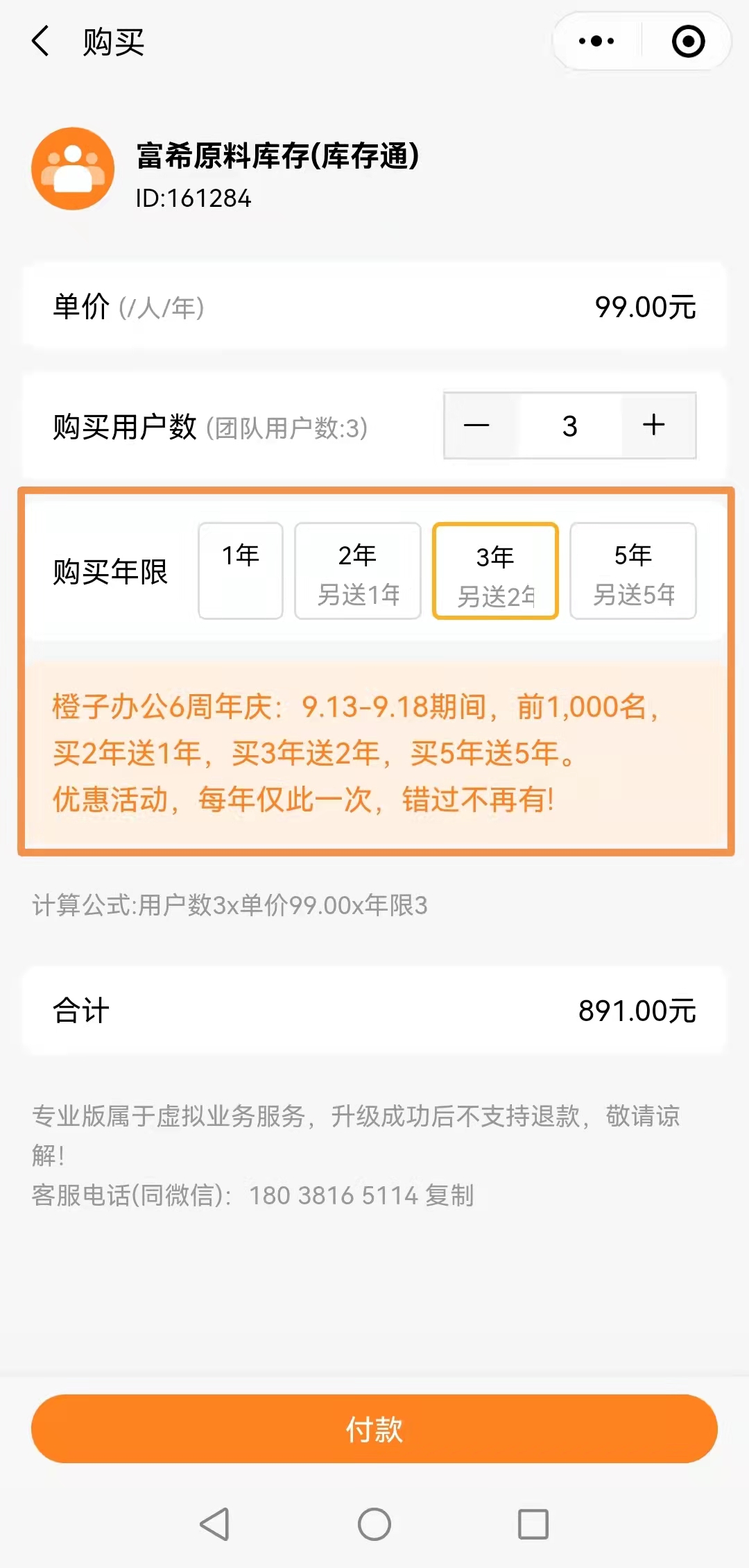 团队管理员可在小程序-我的-团队设置中,直接升级,选择2年或3年将自动获得优惠。