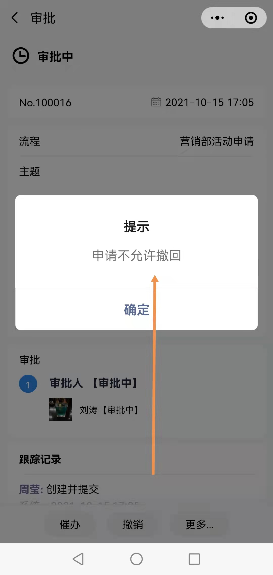 2.申请人提交申请后,点击撤销时,提示:申请不允许撤回。