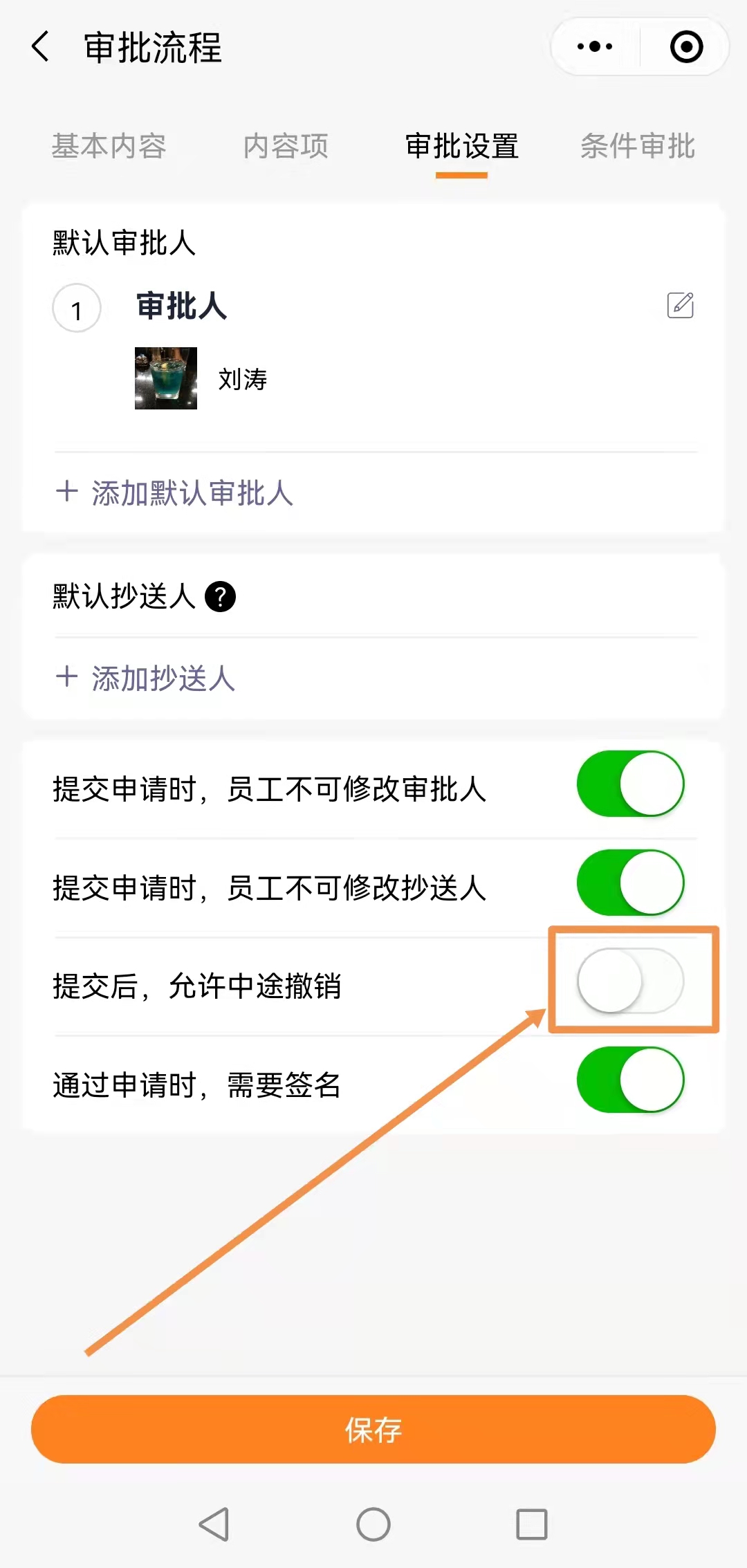 橙子审批中,每个流程设置中,都有一个是否允许申请人中途撤回申请的功能。