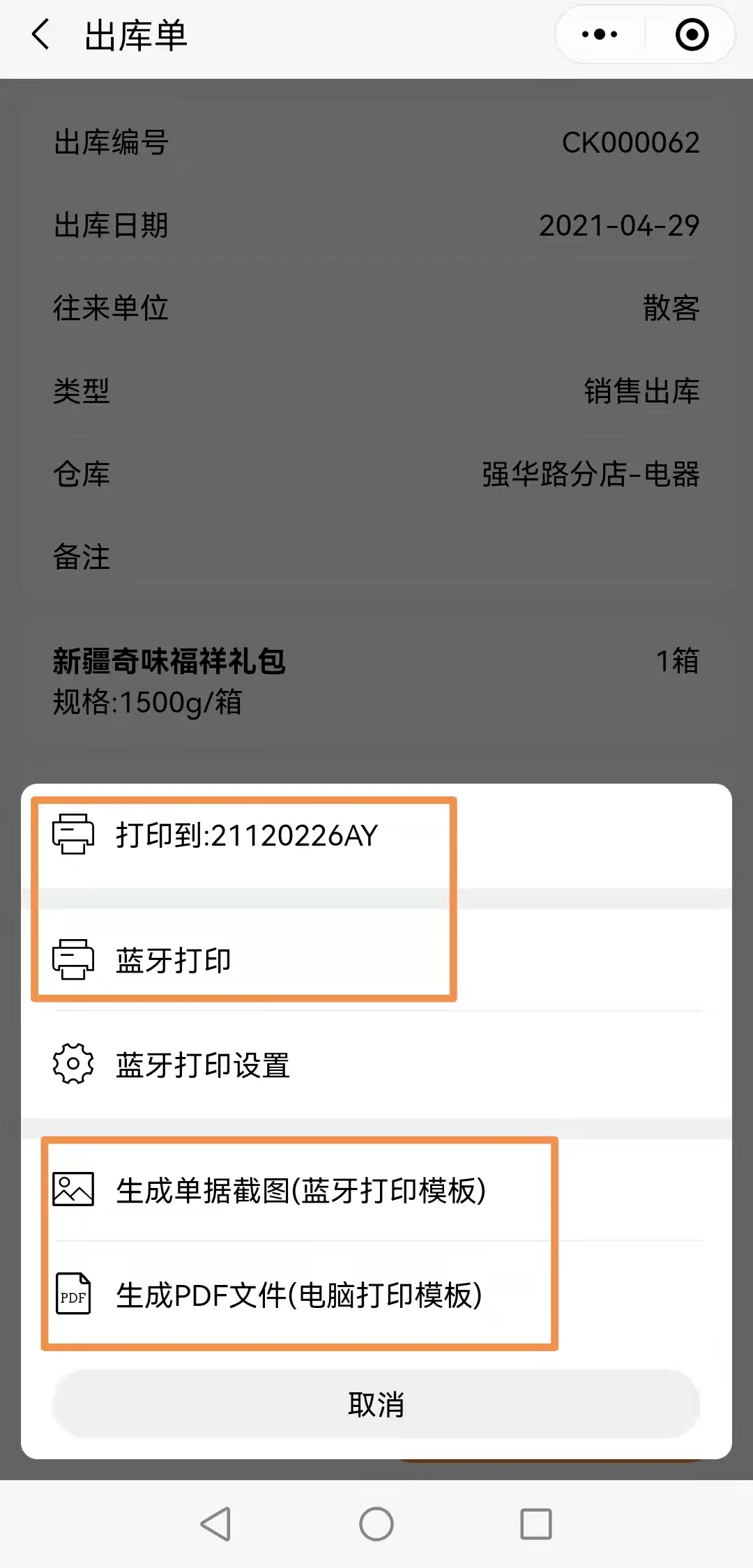橙子通系列中,库存通,进销存、店铺通三个模块,均可在手机端打印相关单据。