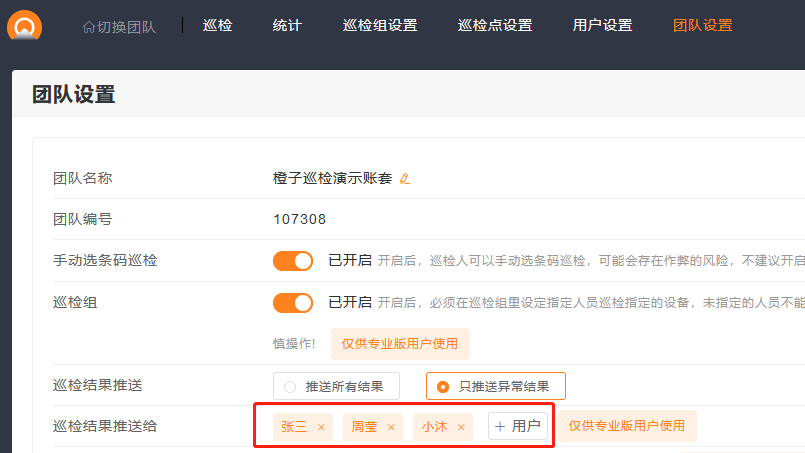 1.管理员在团队设置中,选择推送全部或者异常后,可以设置推送相关人。