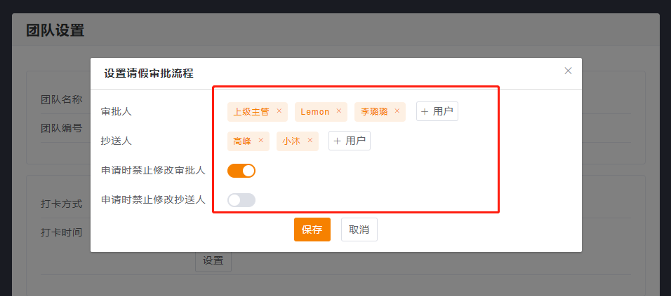 1.首先管理员在团队设置页面,设置对应申请的审批流程。