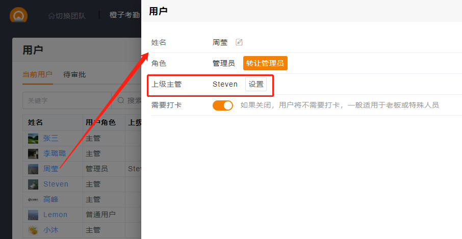 3.其中涉及到上级主管的,可以在用户列表设置。