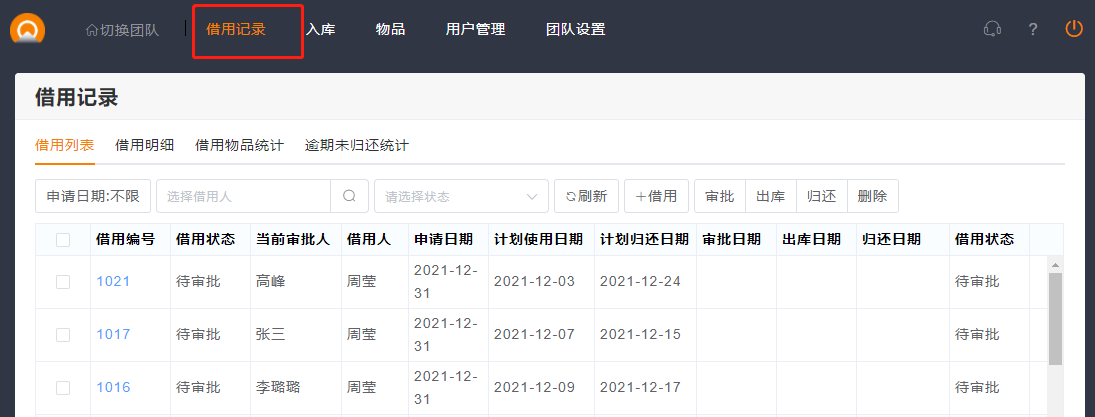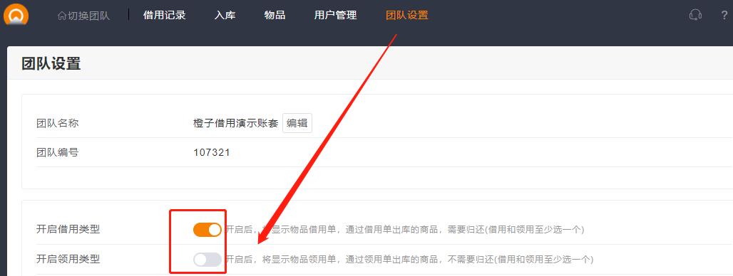 (创建团队时,默认是借用和领用全部开启)