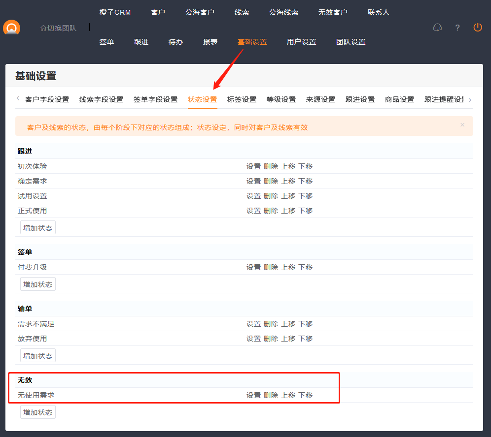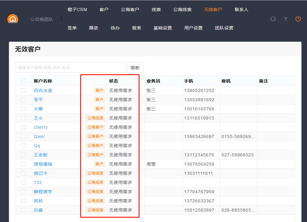 橙子客户管理CRM中,客户有多种状态,如果客户无需跟进,也不方便删除,可以设置此客户状态为失效状态。