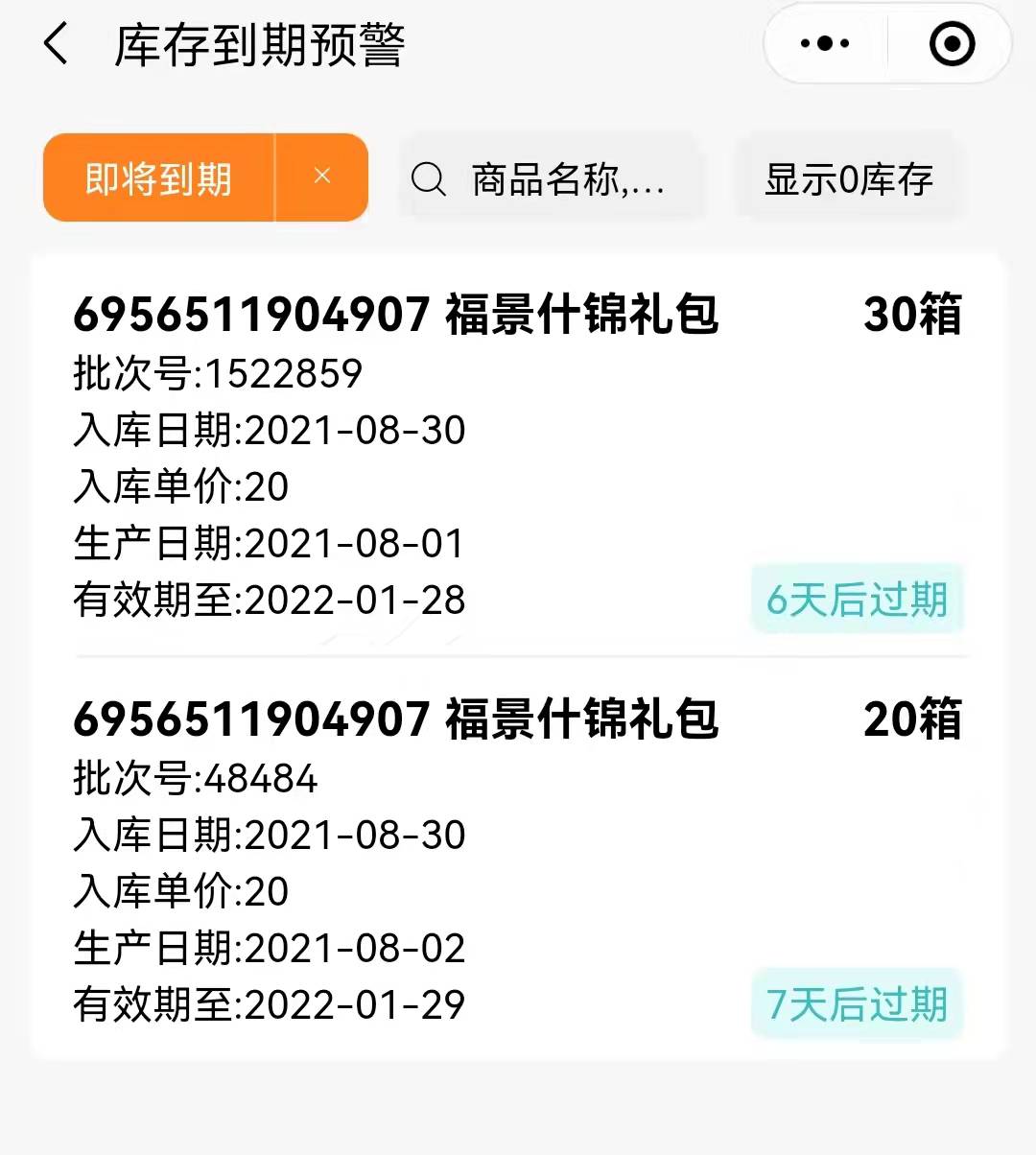 3.点击进入即可显示即将到期商品。
