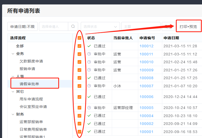 3.所以,可以先点击左边,选择一个流程,再选择申请单,批量打印。