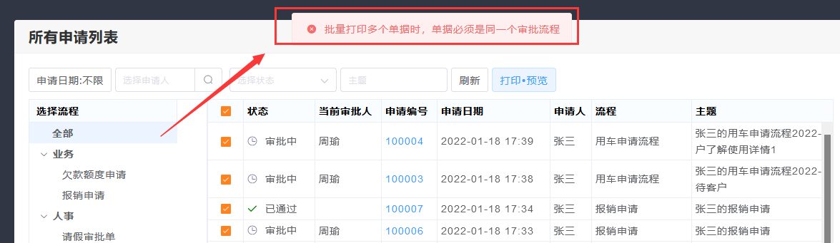 注意:如果批量打印,申请单必须是同一个流程。