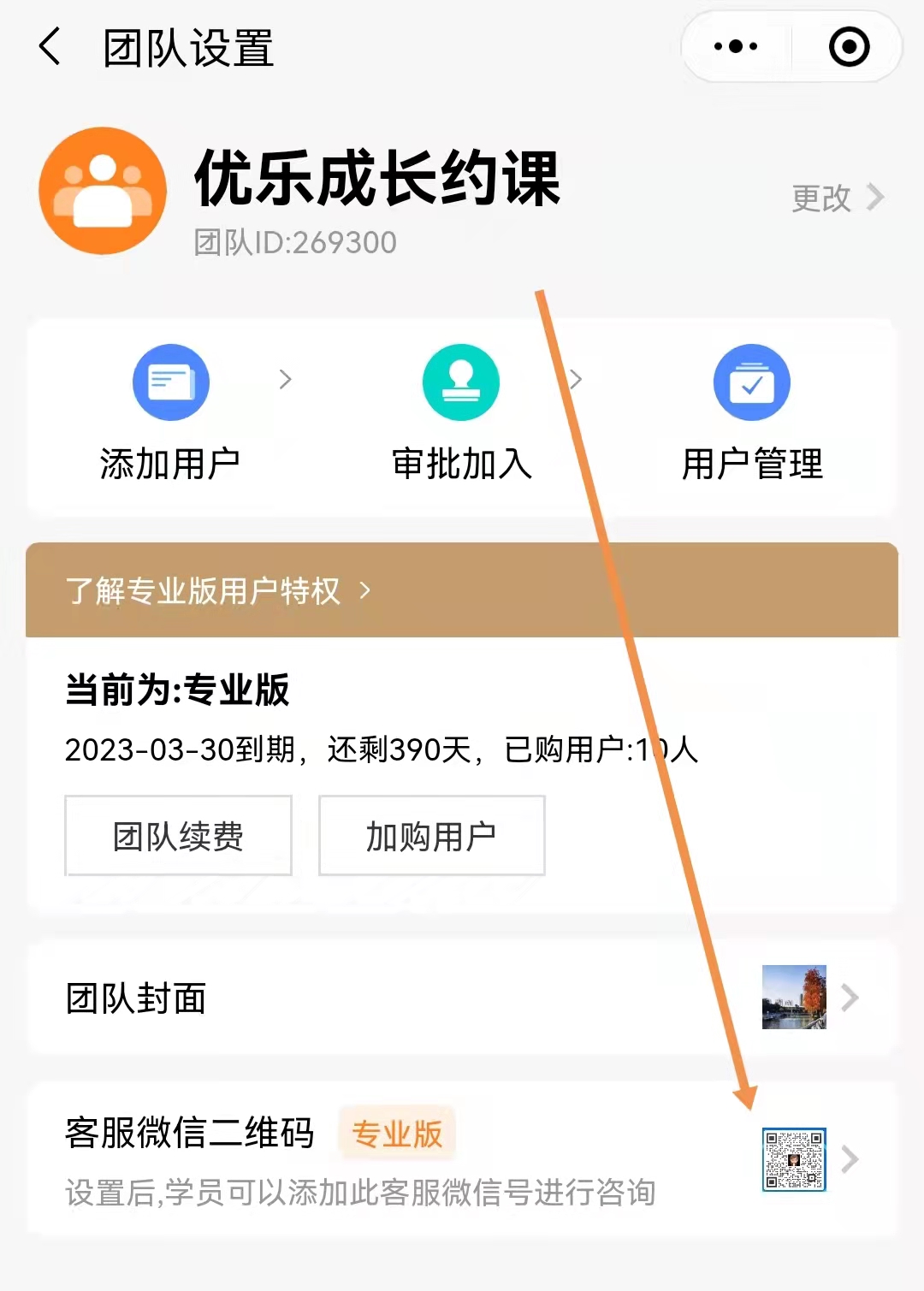 1.管理员在团队设置中,可以上传客服微信二维码。
