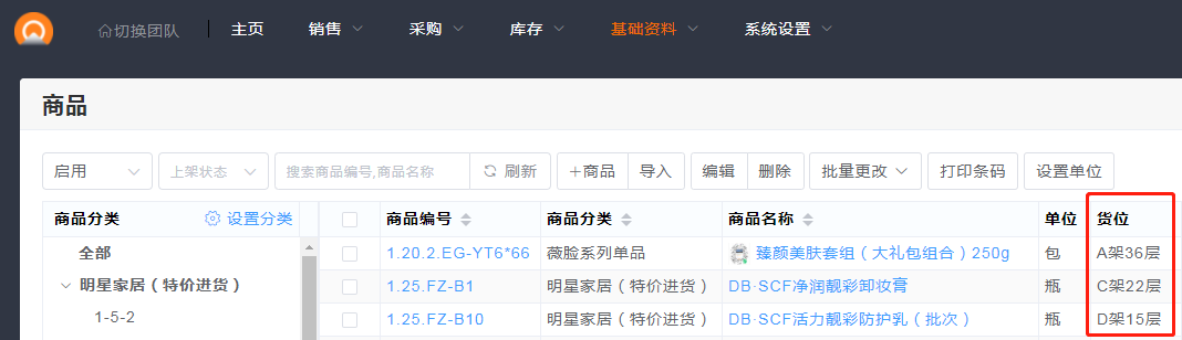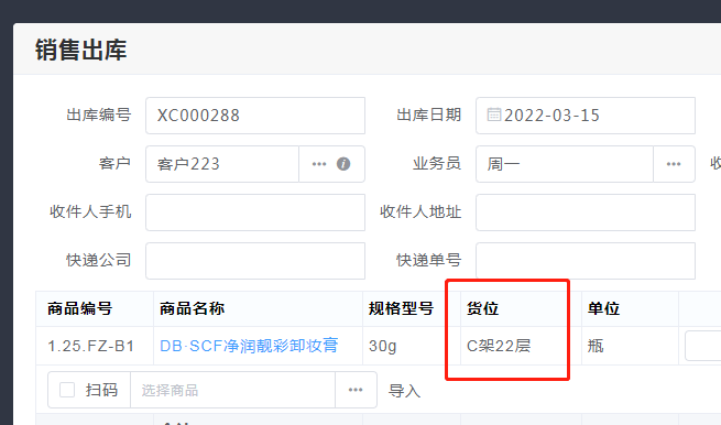 货位管理:商品设置中设置商品存放货位,出入库及库存查询时,可以看到货位显示。