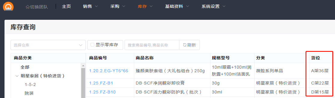 3.同时,在库存查询中,商品也可以显示对应的商品货位等。