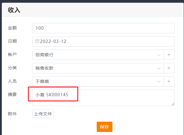 在记账中,收支详情摘要则可以显示此客户及对应收款编号等。