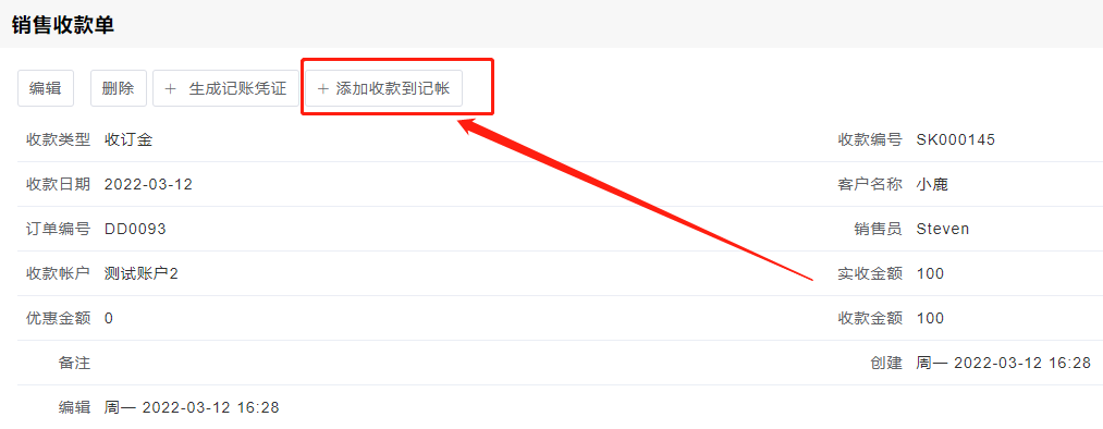 绑定成功后,进销存的销售收款单,有收款的销售订单,销售出库单均可以直接在详情里,添加收款到记账。