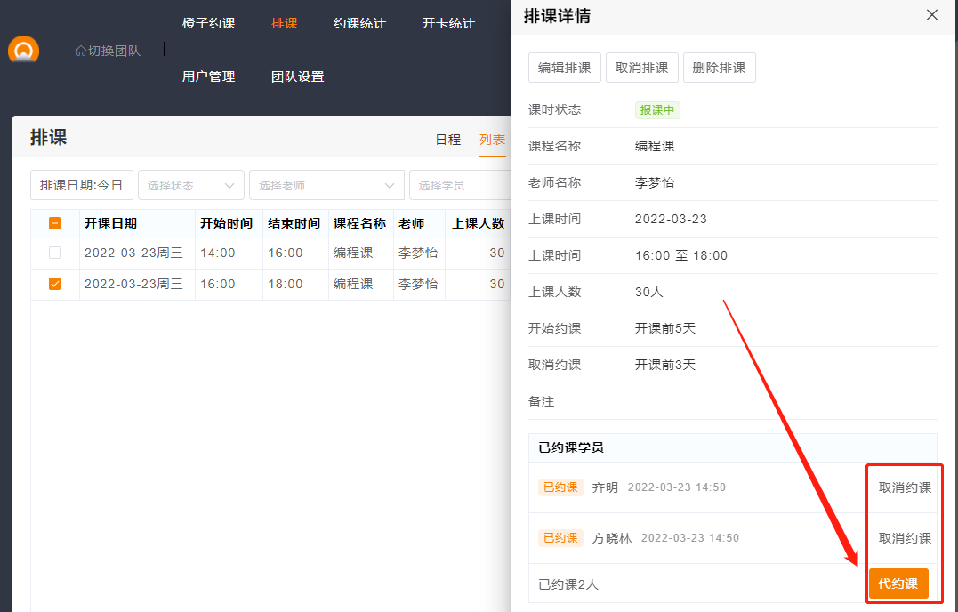 1.在网页端,可以由老师代为约课,在排课详情里,可以直接点击代为约课,或者取消约课等。